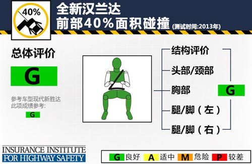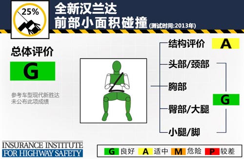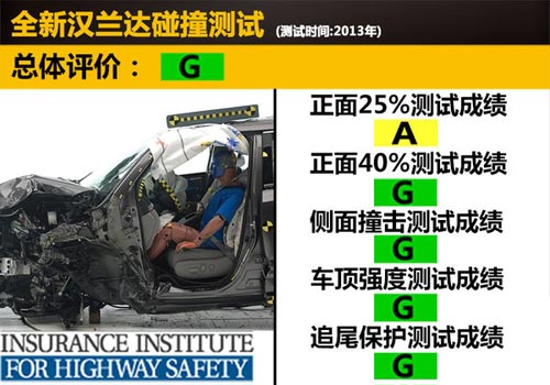參加測(cè)試的車型為豐田新一代美規(guī)漢蘭達(dá),最終的總體評(píng)價(jià)為最高級(jí)別“G”。新車在嚴(yán)苛的小面積碰撞測(cè)試項(xiàng)目中總成績(jī)是“A”(適中),在正面40%碰撞測(cè)試、側(cè)面碰撞測(cè)試、車頂強(qiáng)度和追尾保護(hù)測(cè)試中均取得了良好的成績(jī)。我們選擇的參照車型現(xiàn)代新勝達(dá)沒(méi)有公布小面積碰撞測(cè)試成績(jī),其余4項(xiàng)總成績(jī)與全新漢蘭達(dá)一致,均為“G”(良好)。