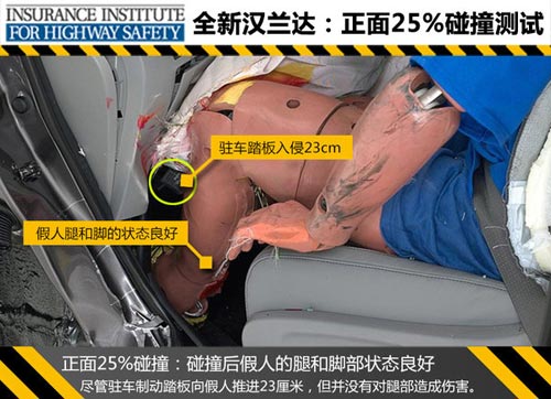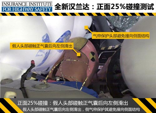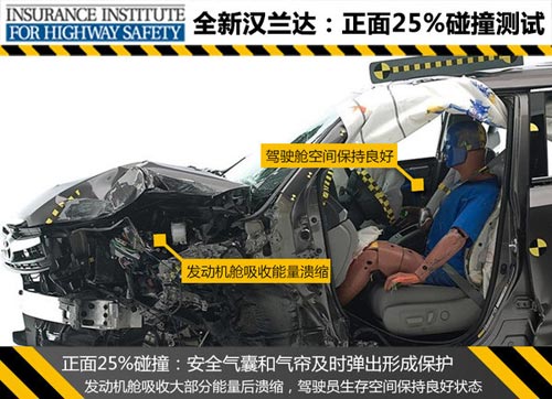 在最為嚴(yán)苛的正面25%碰撞測(cè)試中,全新漢蘭達(dá)受到撞擊后發(fā)動(dòng)機(jī)艙吸收了大部分能量而潰縮,使得駕駛艙受到撞擊能量相應(yīng)減弱,碰撞后駕駛員生存空間保持了良好狀態(tài)。撞擊后駕駛座正面、側(cè)面、膝部安全氣囊以及頭部側(cè)氣簾均及時(shí)彈出,對(duì)模擬駕駛員假人的頭部和軀干形成全方位保護(hù)。