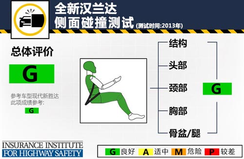 全新漢蘭達(dá)在側(cè)面碰撞中對(duì)車內(nèi)乘員身體各部位均有充分的保護(hù),新車裝備的側(cè)安全氣囊和側(cè)安全氣簾起到重要作用。現(xiàn)代新勝達(dá)的側(cè)面碰撞成績(jī)也很出色,總成績(jī)和各單項(xiàng)成績(jī)均為良好。