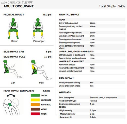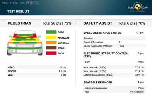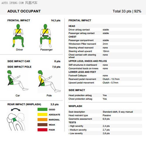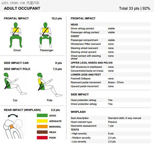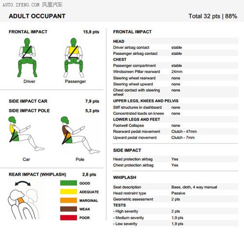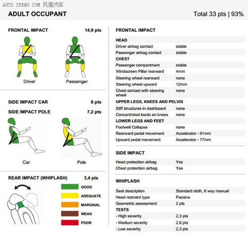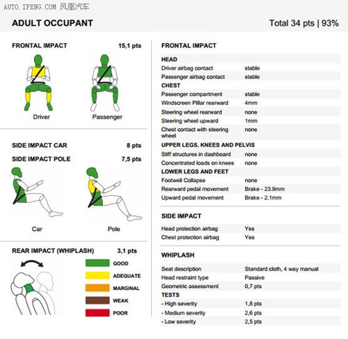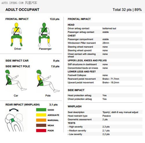 在正面碰撞測試中,車身各項都保持比較高的穩定性,對于駕駛員和乘客的膝蓋和大腿骨都有比較不錯的保護,它對于前排副駕駛席乘客保護的得分是最高的,所有測試的身體部分都能夠得到較好的保護。側面碰撞成績也不錯,甚至在側面柱撞中成績也很不錯,對于胸部的保護是最好的。在后部撞擊的時候,前排座椅和頭部保護裝置對于頸部的保護和不錯。