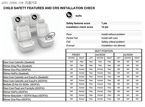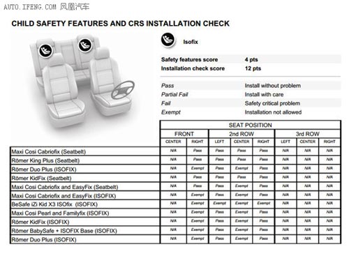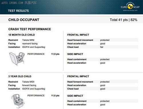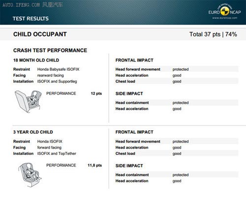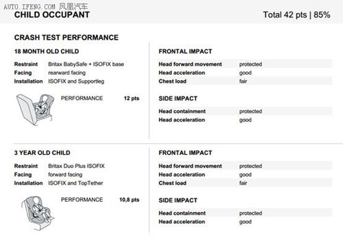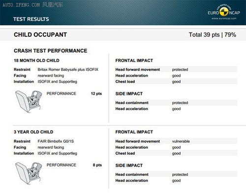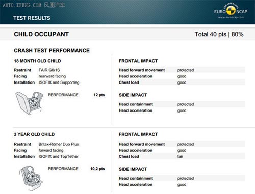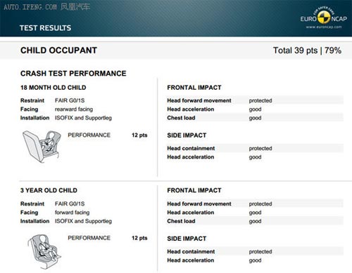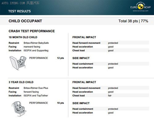 車輛對于18個月大嬰兒保護的成績最好。在正面碰撞測試中,兒童頭部的狀態是可以接受的。在側面碰撞測試中,對于兩種類型兒童座椅內假人的保護也是不錯的。兒童安全座椅的接口兼容性很好,副駕駛席的氣囊可以關閉,如果副駕駛席乘坐兒童的時候駕駛員并未關閉氣囊,警示信息特別明顯。