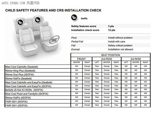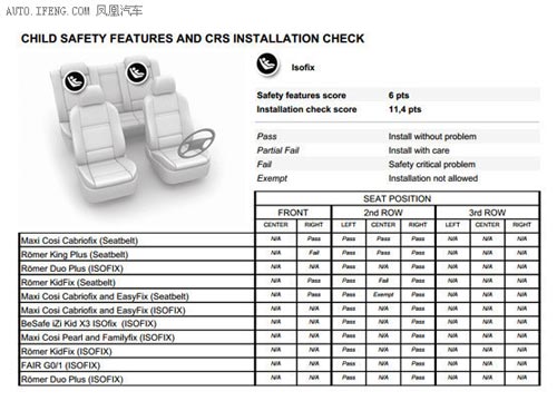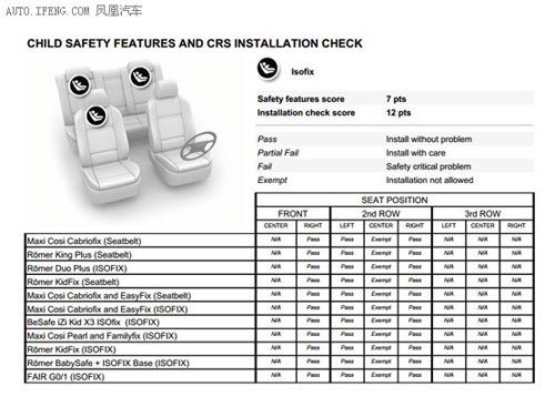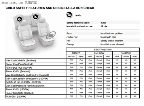對于18個月大嬰兒的保護得分最高,但是在測試中,3歲大兒童的頭部撞擊到C柱,所以對于頭部保護的成績為0分。在側面碰撞測試中,車輛對于假人的保護還是不錯的。兒童安全座椅的接口兼容性很好,副駕駛席的氣囊可以關閉,如果副駕駛席乘坐兒童的時候駕駛員并未關閉氣囊,車內會有明顯的警示。
