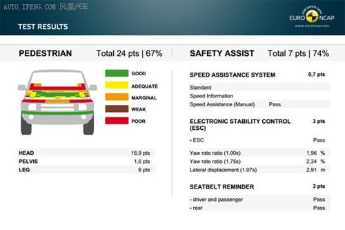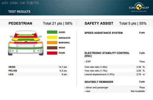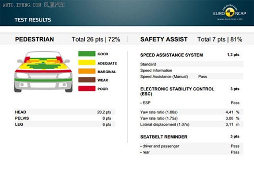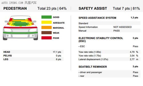 行人保護是鋒馭四個項目中成績最低的一項,但是總體來看,除了發動機邊緣,也就是對于成年人骨盆位置的保護比較差之外,其他大多數區域都還是不錯的。
