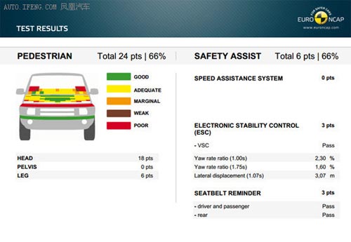 行人保護的成績對于大多數車型來說普遍都是比較低的,但是RAV4能夠獲得66%的成績也并不算差。除了發動機邊緣,也就是對行人骨盆位置的保護成績很差以外,其他部分都可以達到良好的保護。