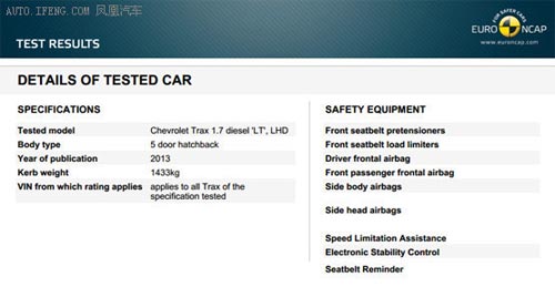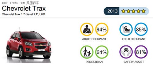 參與E-NCAP碰撞測試的Trax車型搭載的是一臺1.7T柴油發動機,獲得了該系統中最高的五星安全評級。其中承認保護的成績最高,達到了總分的94%,兒童安全保護的成績也還不錯,達到了85%。安全輔助系統的成績也超過了總成績的80%,只是行人保護方面成績相對較差,只能達到及格線。