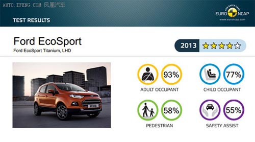 福特EcoSport在國內就是翼搏,是一款小型SUV。它在E-NCAP碰撞測試中的成績并不是特別理想,只獲得了四顆星的成績。對成人和兒童的保護比較周全,但是對于行人和安全配備的得分就比較低了,甚至沒有及格。