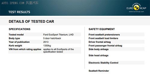 對于18個月嬰兒的保護,EcoSport的得分是最高的。在正面碰撞測試中,車輛對于3歲兒童的保護是不夠的,對于胸部的保護只能算及格。在側面撞擊的時候,車輛對于假人的保護還是不錯的。兒童安全座椅的接口兼容性很好,副駕駛席的氣囊可以關閉,如果副駕駛席乘坐兒童的時候駕駛員并未關閉氣囊,車內會有明顯的警示。