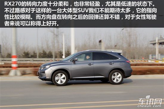 RX270的轉向力度十分柔和,也非常輕盈,尤其是低速的狀態下。不過路感對于這樣的一臺大體型SUV我們不能期待太多,它的指向性比較模糊。而方向盤在轉向之后的回彈還算不錯,對于女性駕駛者來說可以稱得上好開。