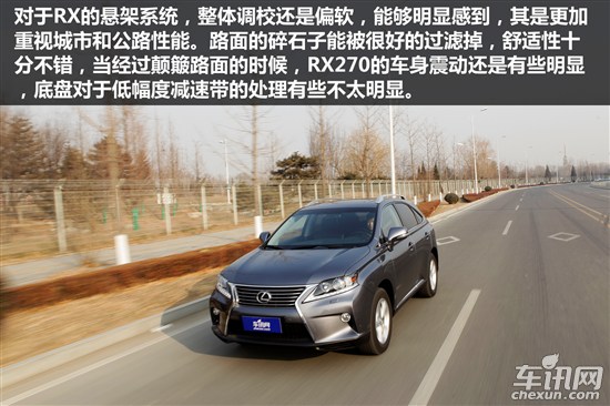對于RX的懸架系統,整體調校還是偏軟,能夠明顯感到,其是更加重視城市和公路性能。路面的碎石子能被很好的過濾掉,舒適性十分不錯,當經過顛簸路面的時候,RX270的車身震動還是有些明顯,底盤對于低幅度減速帶的處理有些不太明顯。