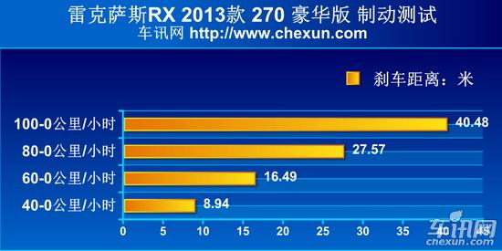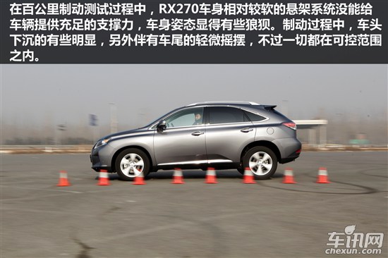 在百公里制動測試過程中,RX270車身相對較軟的懸架系統沒能給車輛提供充足的支撐力,車身姿態顯得有些狼狽。制動過程中,車頭下沉的有些明顯,另外伴有車尾的輕微搖擺,不過一切都在可控范圍之內。