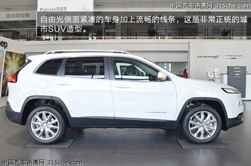 Jeep自由光的車身側面線條與Jeep家族的其它車型方正陽剛的風格不同,大傾角的前擋風玻璃和收縮式的側窗輪廓再加上車頂行李架、光潔的漆面腰線,這些更為符合其城市SUV應有的時尚風格。自由光的輪廓的造型則與牧馬人相似,宣示著其將優于普通都市SUV的通過性。