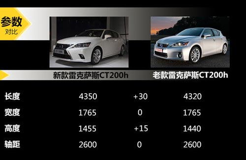 在車身尺寸方面,雷克薩斯新款CT200h的車型基本保持了老款參數,長寬高分別為4320mm/1765mm/1430mm,僅在高度方面相比現款 CT200h減少10mm,而軸距則依舊保持在2600mm。