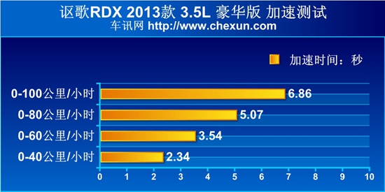 最后的測(cè)試結(jié)果,謳歌RDX3.5L 豪華版的百公里加速是6.86s。這樣的100公里加速成績(jī)?cè)谶@一級(jí)別的車型中也是極為搶眼的表現(xiàn)了。