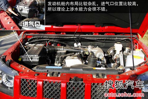 發動機艙內布局比較雜亂,不過上部大面積的隔音棉還是很厚道的。北京40的進氣口位置比較高,基本與發動機艙蓋同高,加上較高的底盤高度,所以這樣的設計會給它帶來很不錯的涉水基礎。