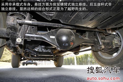 北京40采用硬派越野車慣用的非承載式車身,懸掛方面為前雙橫臂式獨立懸掛,后五連桿式非獨立懸掛。這樣的組合形式正是為了越野而生的,不過底盤處變速箱和分動箱下方并沒有采用下護板進行保護,所以在進行高強度越野時所產生的托底有可能會對這些部件造成損傷。