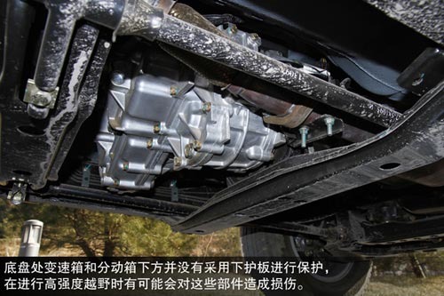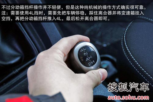 不過分動箱擋桿操作并不輕便,需要使用較大力氣才能掛入相應擋位,但是這種純機械的操作方式確實很可靠。注:需要使用4L擋時,需要先把車輛停穩,踩住離合器并將變速箱掛入空擋,再把分動箱擋桿推入4L,最后松開離合器即可。