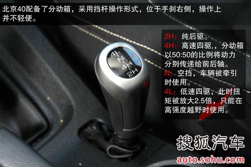 北京40配有分動箱,采用擋桿的操作方式,位于手剎右側,帶有四種模式,分別為:2H:兩驅,此時車輛為純后驅的驅動形式;4H:高速四驅,分動箱以50:50的比例將動力分別傳遞給前后軸;N:空擋,車輛被牽引時使用;4L:低速四驅,此時扭矩被放大2.5倍,只能在高強度越野時使用。