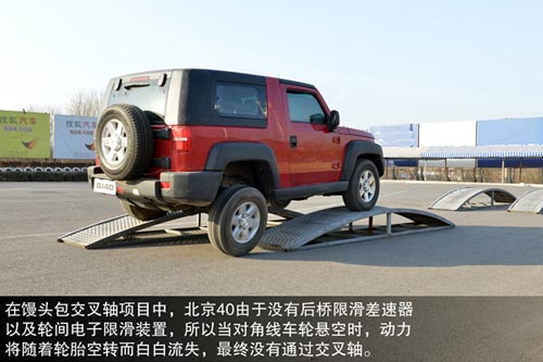 越野之前我們首先對它進行了交叉軸測試,看看這臺沒有配備后橋限滑差速器的北京40能否發生奇跡通過交叉軸測試。在饅頭包交叉軸項目中,北京40還是和預想的一樣,由于輪間沒有任何限滑裝置,所以當對角線車輪懸空時,動力將隨著輪胎空轉而白白流失,最終沒有通過交叉軸。