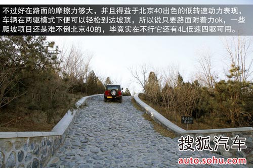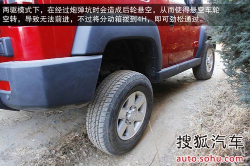 不過兩驅模式下,會在經過炮彈坑時造成后輪懸空,從而使得懸空車輪空轉,導致無法前進,不過將分動箱撥到4H,即可勁松通過。整體來看,北京40盡管低配車型沒有后橋限滑差速器,但是應付像今天這樣的越野項目還是很輕松的,它甚至可以做到不用借助4L低速四驅,看來這個硬漢確實做到了表里如一,沒有令人失望。