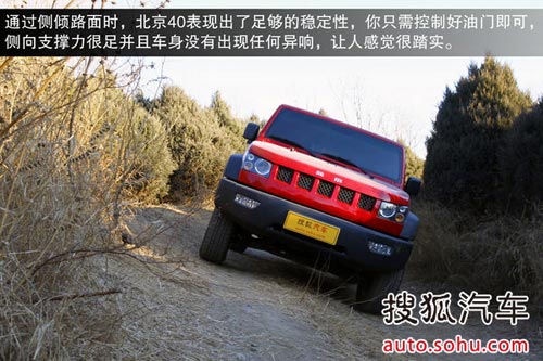 通過側傾路面時,北京40表現出了足夠的穩定性,你只需控制好油門即可,側向支撐力很足,并且車身沒有出現任何異響,讓人感覺很踏實。