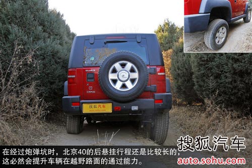 在經過炮彈坑時,我們可以看出,北京40的后懸掛行程還是比較長的,在輕度越野時后輪基本可以一直保持與地面接觸,所以這必然會提升車輛在越野路面的通過能力。