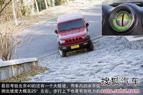 最后考驗北京40的還有一個大陡坡,用車內的水平儀測出,坡度大概在25°左右,這個坡度步行上下也是有些吃力的,不過好在路面的摩擦力夠大,并且得益于車輛出色的低轉速動力表現,車輛在兩驅模式下便可以輕松到達坡頂,所以說只要路面附著力ok,一些爬坡項目還是難不倒北京40的,畢竟實在不行它還有4L低速四驅可用。