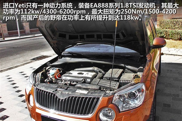 進口Yeti只有一種動力系統,裝備EA888系列的1.8TSI發動機,其最大功率為112kw/4300-6200rpm,最大扭矩為250Nm/1500-4200rpm,與之匹配的是6速濕式雙離合變速系統,而國產后的野帝在功率上有所提升到達118kw。