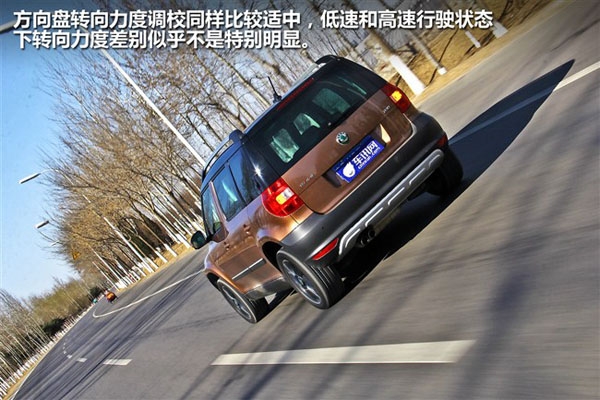 方向盤轉向力度調校同樣比較適中,低速和高速行駛狀態下轉向力度差別似乎不是特別明顯。雖然配置上有OffRoad和外觀處有4x4的越野性標識,但Yeti畢竟不是一款純粹的越野車型,所以配備比較適宜城市道路操控的電子助力轉向系統也是很正常的。