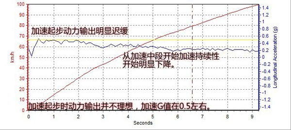 從曲線圖中可以看出,加速起步時動力輸出并不理想,行進加速初段在渦輪的作用下加速勢頭還算比較穩定,加速G值幾近達到0.5g,但從加速中段開始加速持續性開始明顯下降。