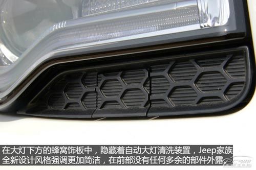 Jeep經(jīng)典的7孔隔柵代代相傳,就連目前品牌內(nèi)最為時(shí)尚的自由光都難逃7孔命運(yùn)。2014款車(chē)型在7孔大蜂窩格柵上配以鍍鉻裝飾,略有棱角的梯形燈眉讓車(chē)頭看上去更為動(dòng)感。