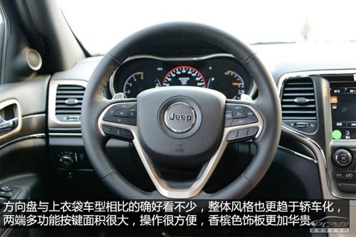 在內(nèi)飾細(xì)節(jié)上,全新的三幅式方向盤(pán)一改死板的越野車(chē)風(fēng)格,在我們印象中克萊斯勒通用的那款方向盤(pán),配上方正的多媒體按鍵著實(shí)讓我們提不起興趣,而眼前的這款帶有配色風(fēng)格的實(shí)木與真皮包裹,加上換擋撥片以及不規(guī)則功能按鍵的方向盤(pán),幾乎可以媲美豪華轎車(chē)。