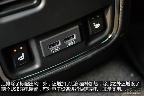 在后排功能上,除了寶成后排有獨(dú)立出風(fēng)口外,在下方還設(shè)置了兩檔座椅加熱功能,中間提供了兩個(gè)USB插孔,可對(duì)移動(dòng)電子設(shè)備進(jìn)行充電,充分考慮后排乘員的感受。