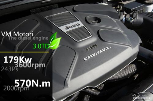 2014款Jeep大切諾基加入了柴油版本,裝載了3.0TD渦輪增壓柴油發(fā)動(dòng)機(jī),這臺(tái)發(fā)動(dòng)機(jī)來(lái)自意大利VM公司,也是唯一一臺(tái)獲得沃德10佳V6柴油機(jī)的。這臺(tái)發(fā)動(dòng)機(jī)還擁有多項(xiàng)技術(shù)專(zhuān)利,最突出的就是這款發(fā)動(dòng)機(jī)最高壓縮比可到16.5:1,與之匹配的汽油泵可瞬時(shí)噴出高達(dá)29000PSI的壓力,除此之外,該款發(fā)動(dòng)機(jī)還取消了柴油機(jī)獨(dú)有的反轉(zhuǎn)平衡軸,這樣就直接降低了發(fā)動(dòng)機(jī)動(dòng)力損耗,也在一定程度上減輕了發(fā)動(dòng)機(jī)重量。這款發(fā)動(dòng)機(jī)其最大功率為179kW/3600rpm最大扭矩為570N.m/2000rpm,與之匹配的是Jeep全新加入的埃孚8速手自一體變速箱,在3.0L汽油版本車(chē)型上依然標(biāo)配了它。