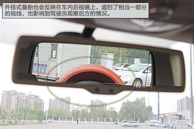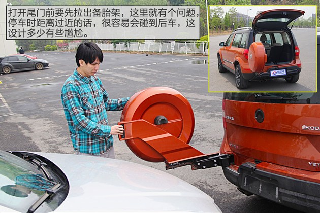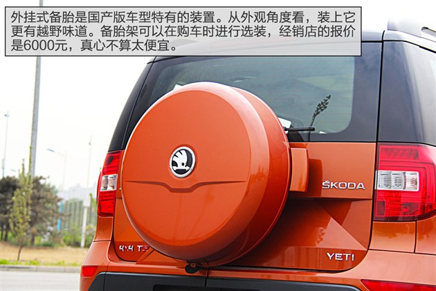 外掛式備胎是廠商特別為國產車型加上去的,認為這樣更能體現野帝的越野風格。這輛試駕車是頂配1.8TSI野驅版,外掛式備胎是標配。其余車型的備胎則放置在后備廂下面。從外觀上看,備胎掛在尾門上確實為整車增添了越野氣息。據經銷店介紹,這個備胎架價值6000元。雖然不算便宜,但的確是真材實料。備胎架與后保險杠相連接,上面設置了電磁鎖。從試駕過程來看,備胎固定的十分牢靠,即使是激烈駕駛也沒有問題。