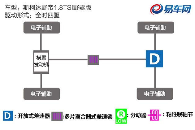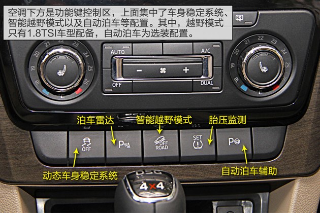 這兩1.8TSI野驅版車型采用的是瀚德提供的全時四驅系統,中央差速器采用主流的電控多片離合器。其中前后橋為開放式差速器,因此并不能實現對車輪的完全鎖止。而是通過電子輔助系統對車輪實施制動。另外,野帝特有的OFF ROAD越野模式帶有陡坡緩解、松軟路況制動系統、ASR牽引力控制等功能。