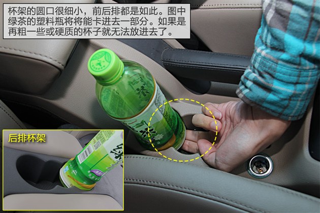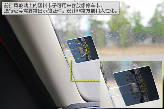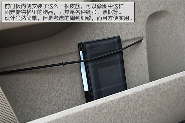 車內的儲物空間比較豐富,其中有幾處的設計十分人性化。比如在門板的儲物格上安裝皮筋,這樣能起到固定物品的作用。還有前擋風玻璃上的塑料卡,用來夾停車卡或票據非常方便。也有設計不夠實用的地方,比如狹小的扶手箱和放不下水瓶的杯架等等。