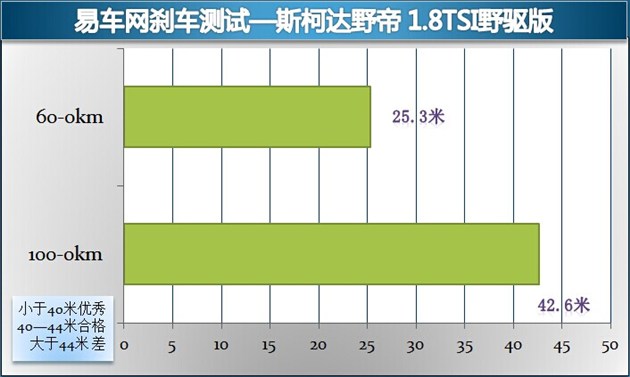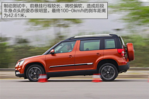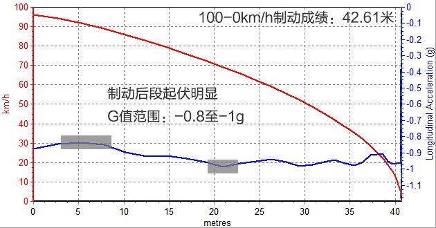 制動測試中,車輛在前段有較好的發揮。由于懸掛調校和避震行程的原因,后段車身出現了明顯的下壓姿態,并且整體的穩定性比較一般。最終,100-0km/h的制動成績為42.61米。