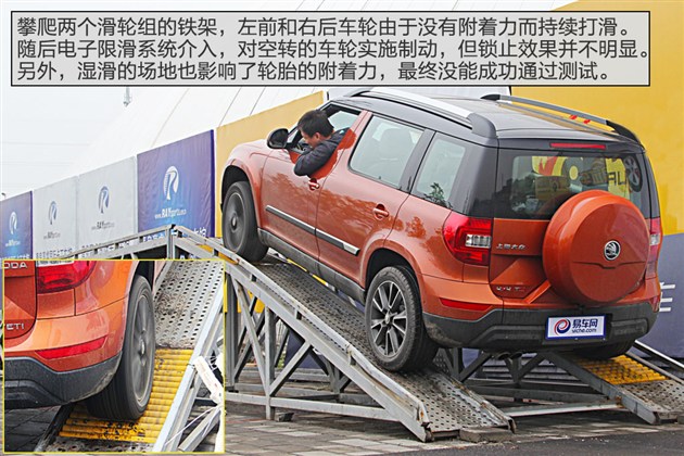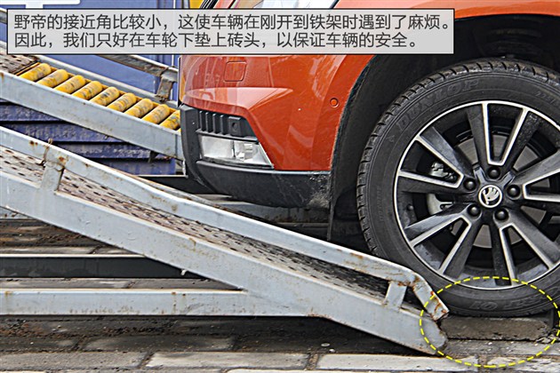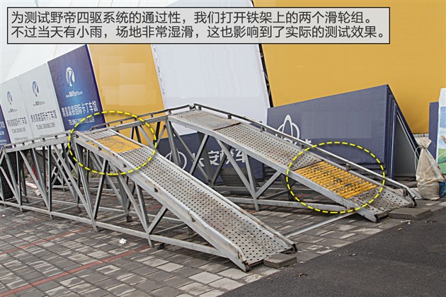 在我們對野帝的四驅系統進行測試時,遇到了兩個難題。一個是車輛的接近角非常小,在攀爬交叉軸鐵架時幾乎碰到了前保險杠。另一個是下雨天對場地的影響很大,濕滑的鐵架也讓最后的攀爬沒有順利完成。