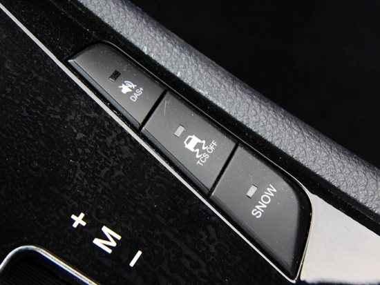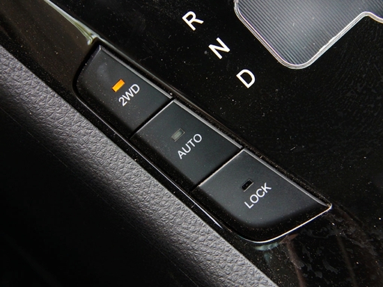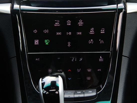 全新大7的排擋桿與中控臺一樣使用大面積黑色鋼琴漆面板,換擋頭的造型做了瘦身處理,顯得很精致。從兩側的按鍵可以看出,四驅模式是可以選擇的。