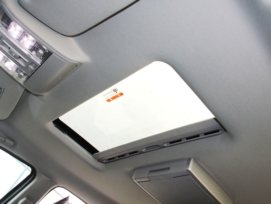 前排中央扶手是雙層設計,內部還有多媒體接口。另外大7由于后排娛樂系統的限制(折疊液晶屏),所以天窗的尺寸并不大:長290mm、寬600mm。