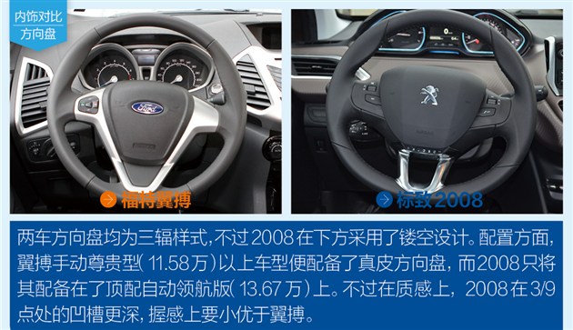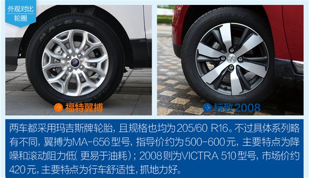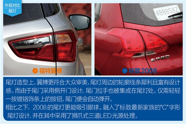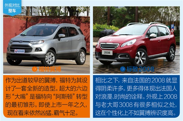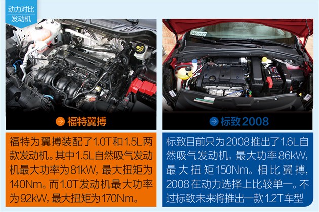 全文總結:兩車雖然定位為同一級別,但是兩車風格可謂截然不同。給我感覺翼搏硬朗的外形,外掛備胎+高通過性的底盤設定等更偏重男性的審美標準。而相比之下,標致2008則更符合女性對時尚、浪漫的訴求。動力方面更是如此,尤其是翼搏1.0L GTDi 手動尊貴型,絕對能讓你體驗到酣暢淋漓的駕駛快感。這臺1.0T Ecoboost發動機可是榮獲過沃德十佳發動機殊榮的得主哦!而這1.0T+5MT的動力組合,目前福特家族車系中只此一款。