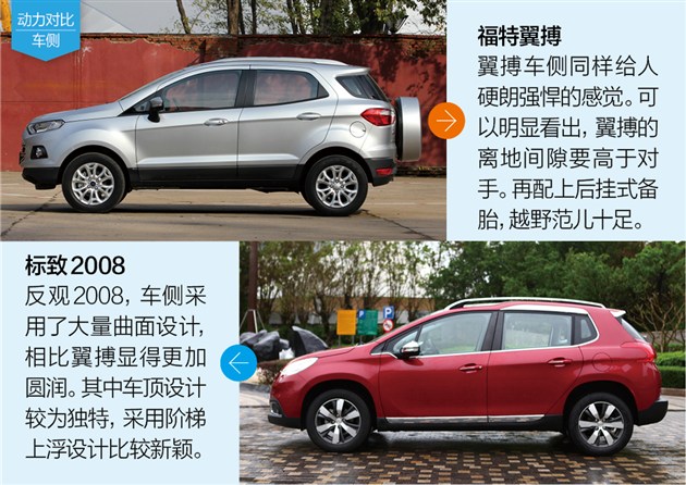 從尺寸上來看,翼搏占據明顯優勢,尤其是在最小離地間隙上,172mm的數據甚至超過了更高一級的SUV競品車型。這也符合外掛式備胎充滿力量感和越野范兒的特征。而2008的140mm最小離地間隙勉強算是SUV的及格線,在同級別SUV中算是比較靠下了的。