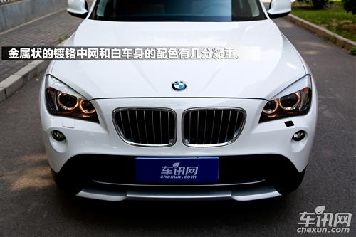 由于這款寶馬X1是頂配車型,所以經典進氣格柵采用的是鍍鉻中網,金屬狀的鍍鉻中網和白車身的配色有幾分凝重。無論從正前方還是斜前方看來,整個前臉設計都給人平平淡淡的感覺。大燈算是點睛之筆,除了配備了標配大燈清洗裝置、天使眼日間行車燈以及雙透鏡氙氣大燈之外,也是唯一一款具有隨動自動控制和遠光自動控制的車型。