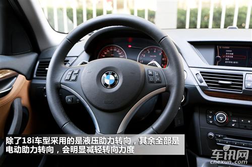 在來看看華晨寶馬X1的方向盤,雖然風格一般,但是需要介紹的是這款轉向系統采用的是電動助力系統,除了18i車型采用的是液壓助力轉向,其余全部是電動助力轉向,會明顯減輕轉向力度,這對女性朋友們而言是個福音。因為華晨寶馬X1的購買用戶相信會有50%會是女性朋友,在這樣一款豪華車型上,依舊很費力的轉向停車,實在是很不和諧的場面。