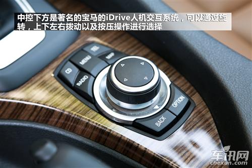 中控下方是著名的寶馬的iDrive人機交互系統,可以通過旋轉,上下左右撥動以及按壓操作進行選擇,其上手難度也不高,旋鈕旁的七個快捷鍵布局比較緊密,集成了導航、DVD等多種功能,配合中控臺上的液晶顯示屏實用,操作旋鈕阻尼感強,在實際操作時系統沒有一絲延遲。中控臺下方還配備了USB以及AUX-in接口。