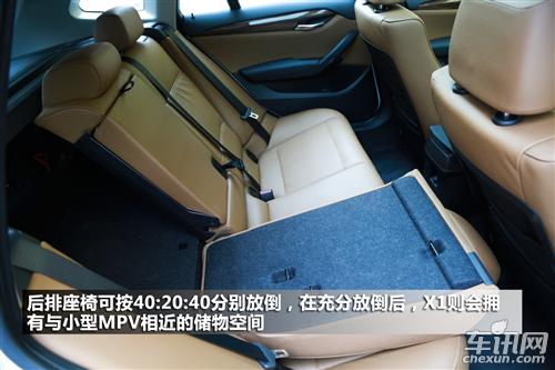 后排座椅可按40:20:40分別放倒,在充分放倒后,X1則會擁有與小型MPV相近的儲物空間,并且具有固定裝置。國產寶馬X1的后排座椅是一個亮點,不同于多數車型4/6分折的形式,轉而設計成4/2/4的形式,也就是說,包括中央扶手在內的那個很窄的部分也可單獨放倒,我個人認為這樣更加方便了后排乘客對于取放行李箱內的物品過程。