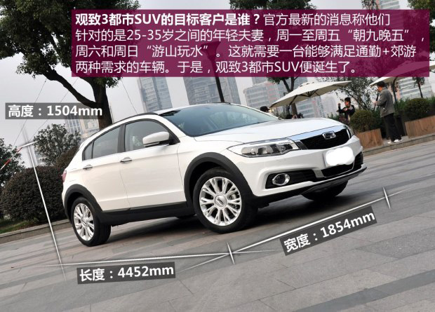 在與廠方技術人員討論觀致3都市SUV究竟是不是SUV的時候,對方反復與我強調這是一款“都市SUV”,這顯然是個文字游戲,從字面意義和產品定位來看它確實可以算作是一款準SUV車型,不過離不開“都市”的它也就意味著其活動范圍并不能像那些真正的SUV那樣跋山涉水,去往那些無人敢涉足的地方。