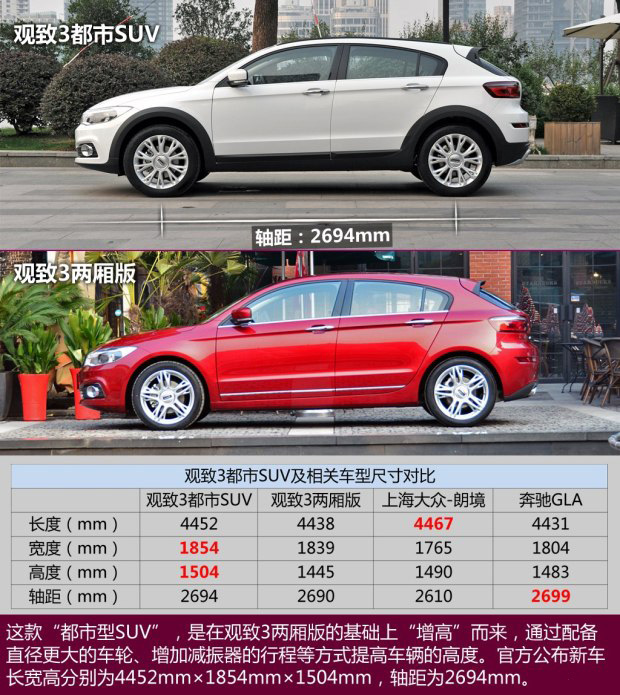 盡管在名字中帶有“SUV”,但是在我們眼中,來源于觀致3兩廂版的它仍然是一臺緊湊型車,只不過它的高度更高,離地間隙更大罷了。該車的長寬高尺寸分別為4452mm×1854mm×1504mm,軸距為2694mm比觀致3兩廂版整整大了一圈,與定位相近的上海大眾朗境相比,除了長度外,其寬度和高度也更有優勢。