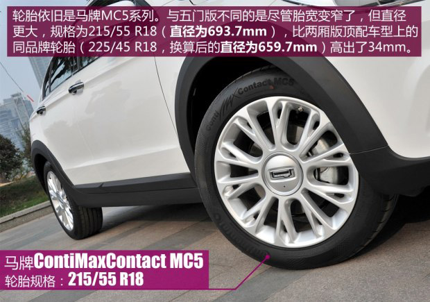 這款車配備的仍然是注重公路性能的馬牌ContiMaxContact MC5輪胎,雖然寬度要比兩廂版頂配車型的同型號輪胎要稍窄一些,但是規格為215/55 R18的輪胎在直徑上則要多出34mm,這也間接提高了車身高度。規格為T125/90 R16的非全尺寸備胎由瑪吉斯提供,這與其他觀致3車型并無不同。