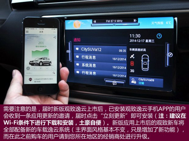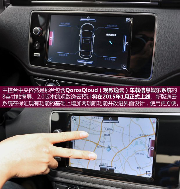 全新的2.0版本觀致逸云系統將在2015年1月份正式上市,通過車輛中控臺上的8英寸觸摸屏和智能手機實現信息互聯功能,從而實現諸如導航信息下發、遠程胎壓監測、保養信息查詢等諸多功能。此外新的2.0版本還在此基礎上增加了觀致手機商城和去接“TA”功能,更符合現在年輕消費者的需求。